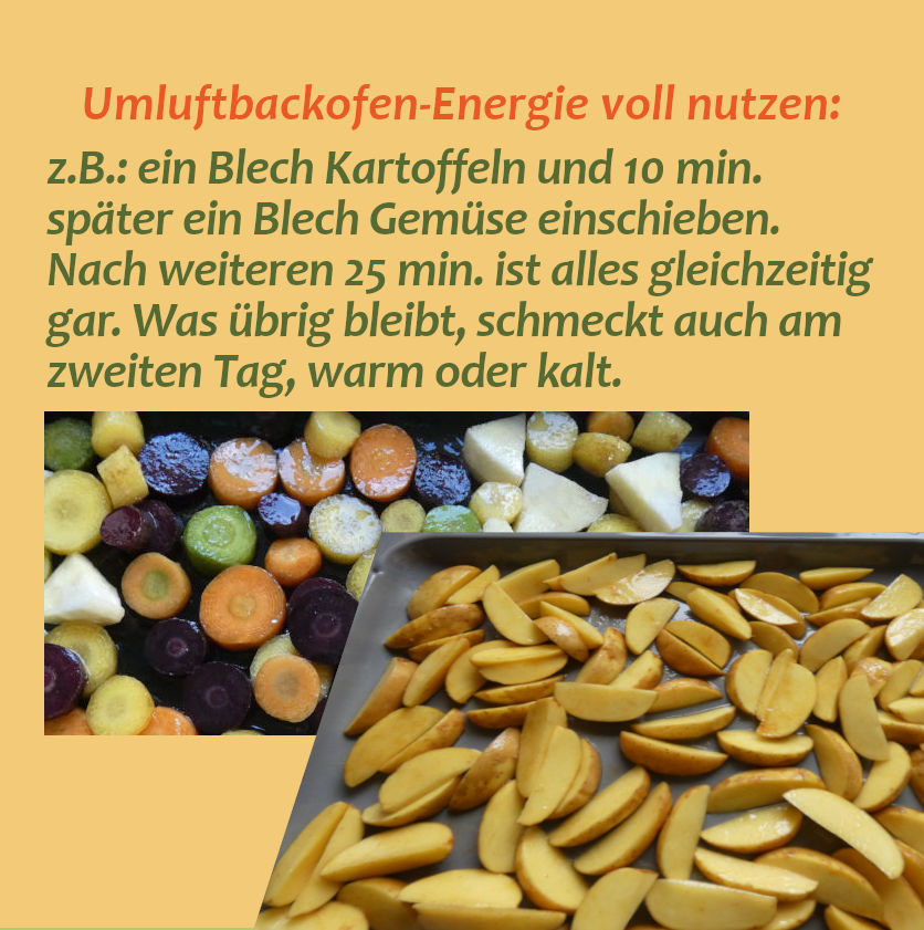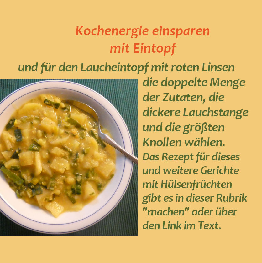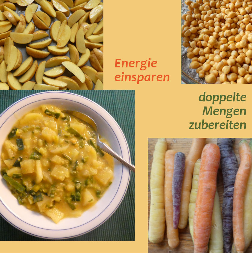und dabei Zeit und Energie sparen. Nicht nur Eintöpfe eignen sich gut als Mittagessen für zwei Tage. Mit der für mehr als eine Mahlzeit berechneten Menge an Nudeln, Hirse oder Kartoffeln kann die Basis gelegt werden für den Nudelauflauf, die Hirsebällchen oder die Knödel am nächsten Tag. Hülsenfrüchte wie Kichererbsen, Linsen oder weiße Bohnen lohnen sich besonders wegen ihrer längeren Kochzeiten. Sie eignen sich fein gewürzt einmal als Solobeilage und passen für ein anderes Ma(h)l in die Gemüsepfanne.