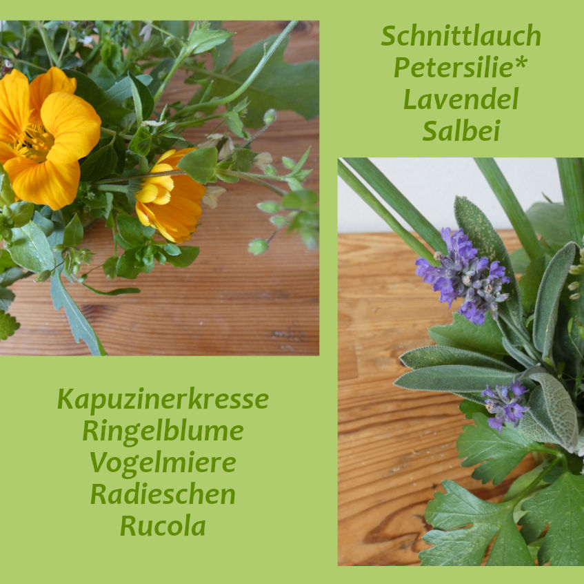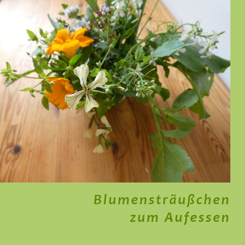 erfreuen uns mit Anblick UND Aromen. Für alle, die Blumen lieben und es daher mit den Worten Christian Morgensterns halten: "Ich habe heute ein paar Blumen nicht gepflückt, um dir ihr Leben zu schenken!" bahnt sich hier die Lösung an: Ein Blumensträußchen aus essbaren Kräutern, Blüten und Blättern, ein Sträußchen Lebensmittel. Ein echter Hingucker kann es sein, zumindest, solange noch nichts vor sich hinwelkt und das Leben langsam aushaucht. Doch statt bange zuzugucken, wie ein Pflänzchen nach dem anderen - im wahrsten Wortsinn - schlapp macht, nutzen wir das Sträußchen kulinarisch.
