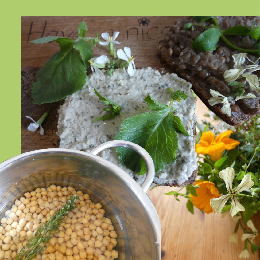 Radieschen und Ruccola fegen mit Blatt und Blüte die Tristess vom Brot, schmecken frisch und würzig. Wer es bunter mag, kann mit Kapuzinerkresse und Ringelblumenblüten noch schöner variieren. Das ausdauernde Bohnenkraut darf zu den Kichererbsen, auch wenn es noch lange vasentauglich aussieht. Die Ausdauer im Namen bezieht sich nur auf seine Fähigkeit, zu überwintern und jedes Frühjahr wieder neu auszutreiben. Die Vogelmiere macht sich großartig als Salat mit ihrem milden Geschmack und den kleinen Sternenblüten.