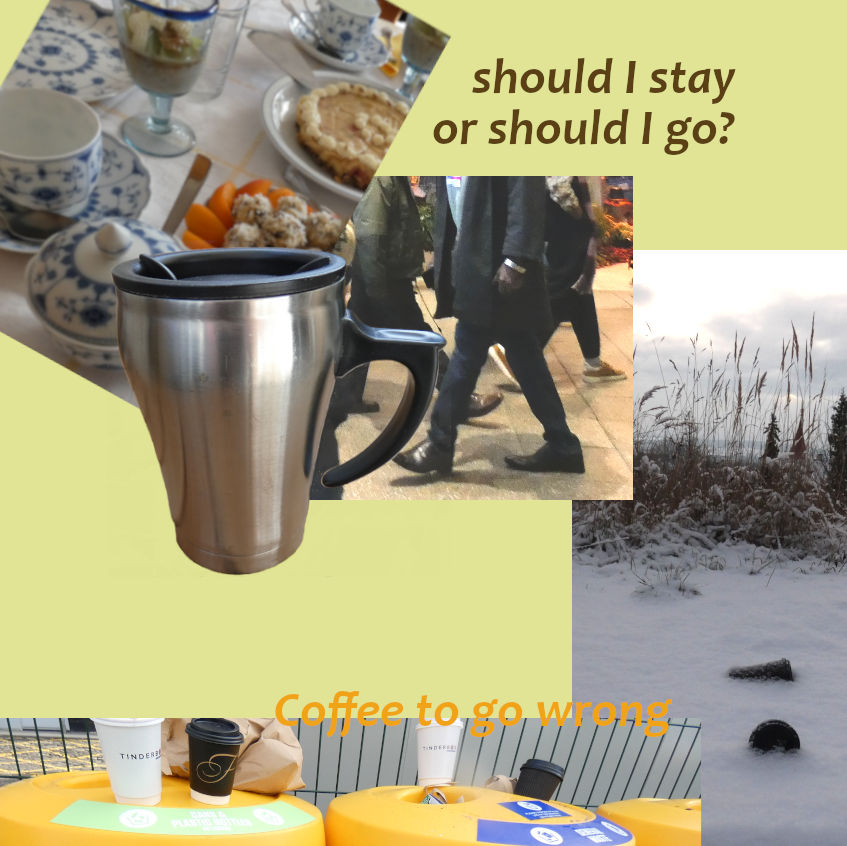 Am Kaffeetisch zu sitzen ist vielleicht auch ein lästiges Ritual, ein Kaffeekränzchen mit Klatsch und Tratsch, eingeklemmt zwischen alten Verwandten. Ein Kaffee "zum hier trinken?" hat immer etwas Verbindliches. Ich gehe die Verpflichtung ein, solange da zu bleiben, bis ich genug getrunken habe. Coffee-to-stay heißt, ausharren, aushalten, was da kommt. Mit meinem"...- to-go" kann ich einer unbehaglichen Situation einfach entrinnen.