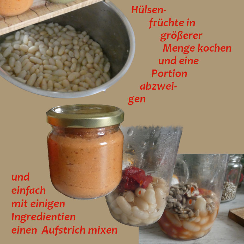Wenn ausreichend viele Hülsenfrüchte für eine Mahlzeit gekocht werden, einfach eine Portionen davon abzweigen und als Basis für einen Mix verwenden. Mit wenig weiteren Zutaten entsteht ein würziger Aufstrich, der viel Eiweiß behalten hat. Der Eiweißgehalt der gekochten Hülsenfrüchte liegt etwa halb so hoch wie auf der Verpackung angegeben, da beim Quellen und Kochen viel Wasser aufgenommen wurde.