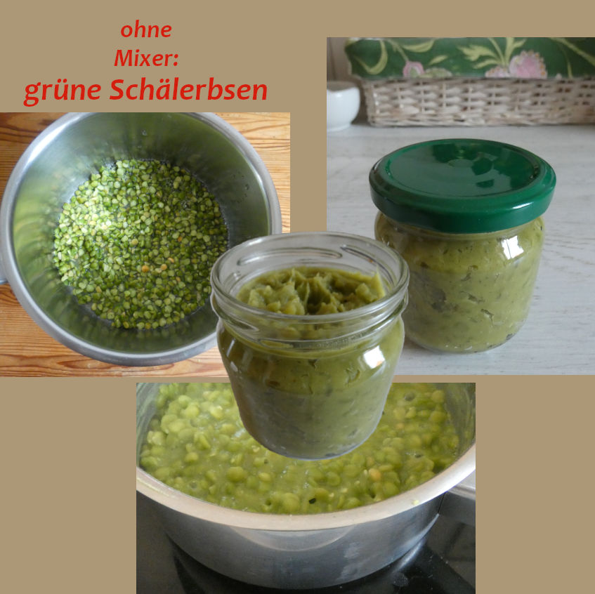 - Wenn es Erbsen und Möhren gibt: 3 Eßl. Erbsen mit einer Prise Salz, Pfeffer, Oregano und je 1 Teel. Öl und Apfelessig zerdrücken.