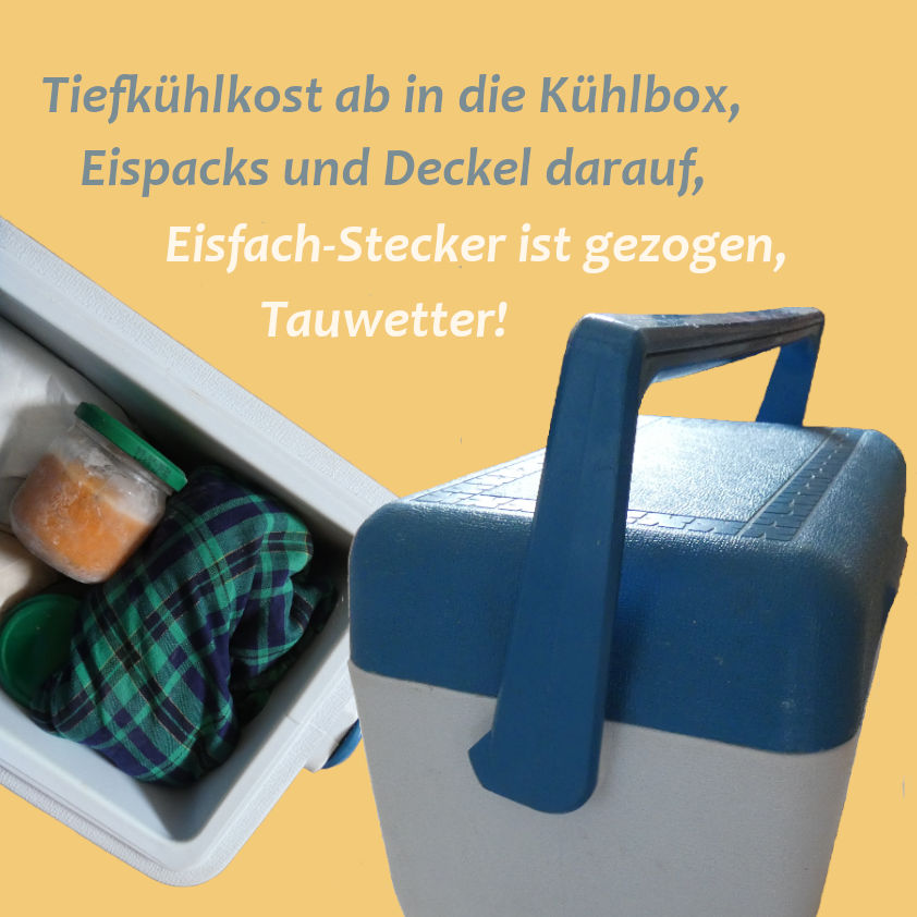 Nun gilt es, die noch vorhandenen Leckereien aufzuessen, am besten bis zur gähnenden Leere des Frosters, mindestens aber bis zum Fassungsvermögen der Kühlbox. Mit Kühlpacks und Kühl-Akkus bestückt hält diese unsere Tiefkühlschätze auf eisiger Temperatur. Mit dem Steckerziehen bleibt bei Kombigeräten auch das Lämpchen im Kühlschrank aus. Wenn wir nur in dringenden Fällen die Türe öffnen, wird auch hier der Inhalt die Abtauzeit des Kombi-Partners überstehen.