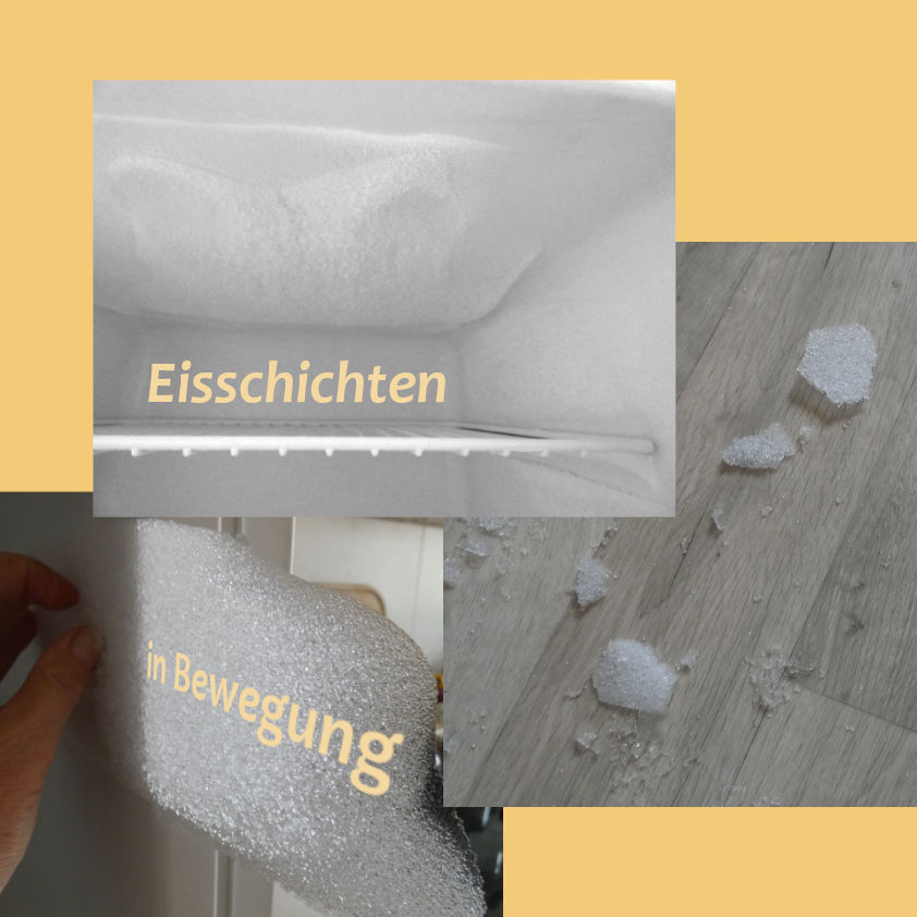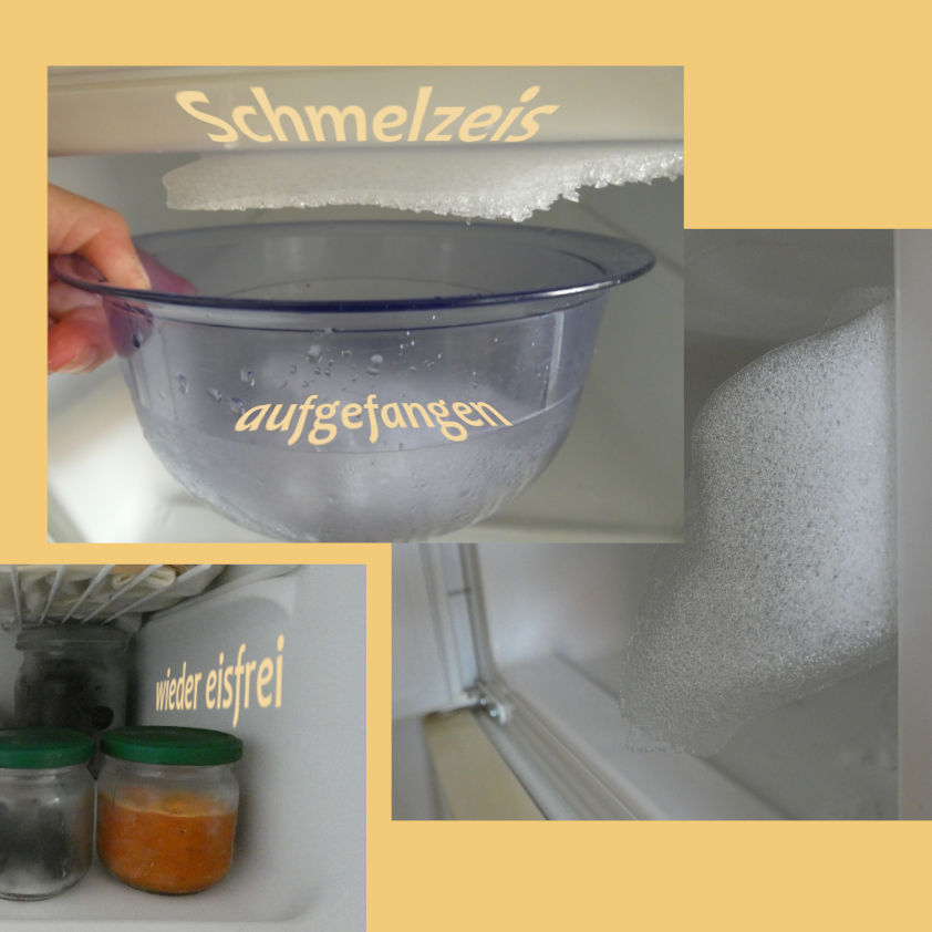 Bei schön glatten Geräte-Innenwänden kann nach einem Viertelstündchen einmal getestet werden, ob sich die Eisplatten schon lösen und herausschieben lassen. Eine Schüssel rechtzeitig zur Hand? Bald kann auch das Deckeneis herausgezogen und auffangen werden ohne große Pfützenbildung. Nach dem Entfernen von allem Eis und Tauwasser wird der Innenraum gereinigt, z.B. mit Essigwasser, und abschließend trocken gerieben. Nun kann die Stromzufuhr kommen, um die geschlossenen Geräte wieder auf tiefe Temperaturen zu bringen. Keine isolierende Eisschicht mehr, durch die sich die Kühlaggregate mit Energieaufwand durcharbeiten müssen, um die Inneräume zu kühlen. Und sehr bald kann das Gefriergut wieder eingeräumt werden. Fertig! Platz für neue Schätze aus dem Garten, von der Streuobstwiese oder für neues Eis - und zwar solches mit Geschmack.