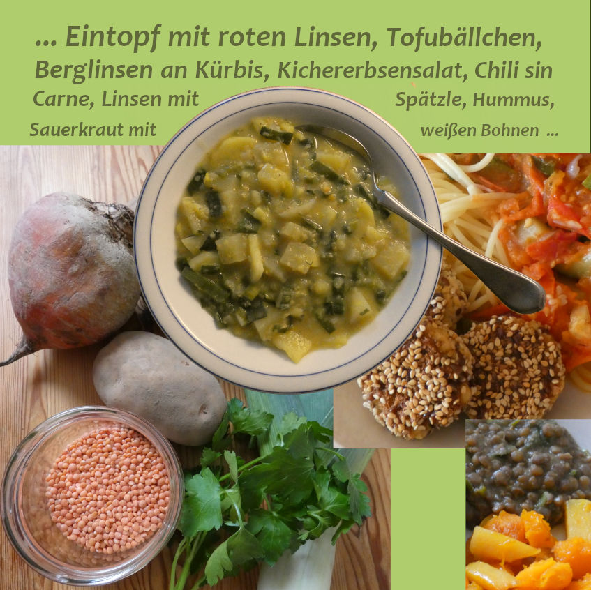 Und jetzt jeden Tag Erbsensuppe? Keineswegs: Chili sin carne, Fallafel, Hummus, Linsen mit Spätzle, Räuchertofu, Lupinenmehl, Erdnuss- oder Linsen-Currys, Tellerlinsen mit Backpflaumen und und und. Unsere traditionellen und auch die jüngeren Speisepläne sind voller Ideen und Zutaten mit Hülsenfrüchten. Hier gibt es noch drei einfache Rezepte für altagstaugliche Mahlzeiten.