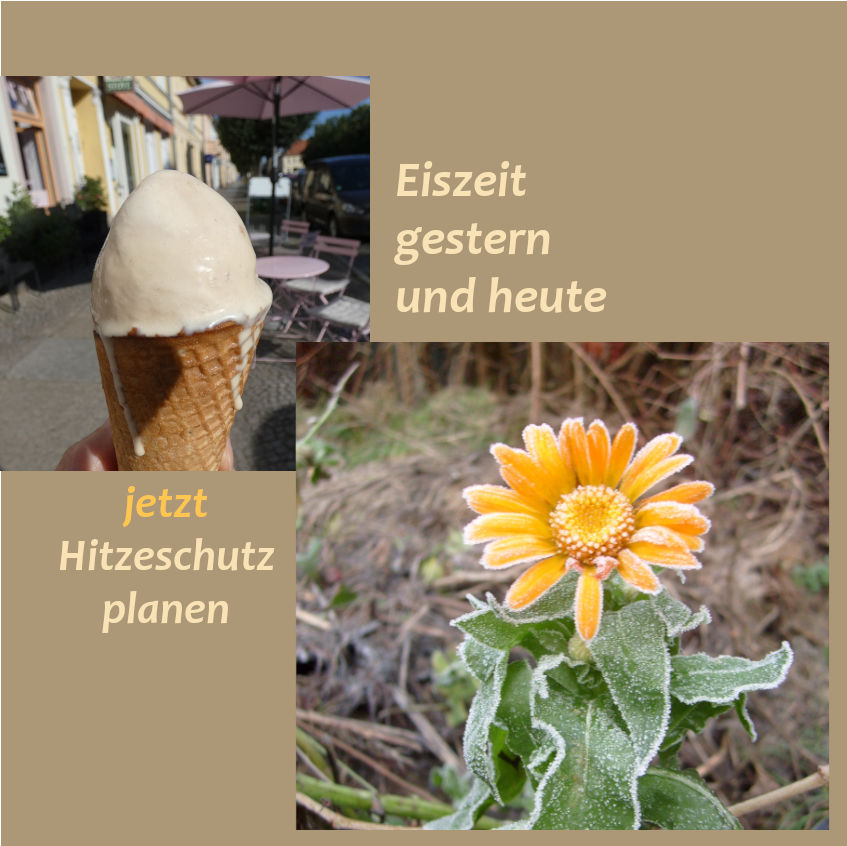 Gestern noch ein Eis auf der Hand, heute schon gefrorene Ringelblumen, so schnell ändern sich die "Eiszeiten". Bei beginnenden, herbstlich kühlen kühlen Temperaturen da draußen geraten die vielen heißen Tage dieses Sommers schnell in Vergessenheit. Doch nach der Hitze ist vor der Hitze und für das nächste Jahr ist jetzt die Zeit zur Vorbereitung. Kommunen, öffentliche Einrichtungen, Betriebe und Nachbarschaften, wir alle sind gefragt. Und wozu Planung? Worum es geht, eröffnet sich vielleicht, wenn Sie anhand folgender Fragestellungen zum Thema Hitzeschutz eine kleine Rückschau halten:
