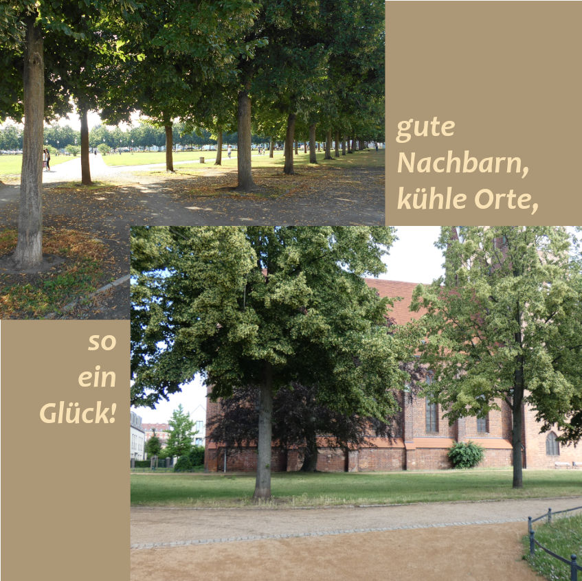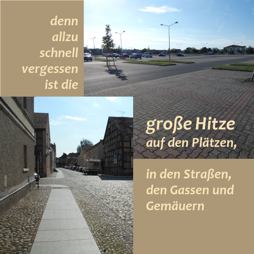 Wie ist es Ihnen ergangen in der heißen Zeit? Konnten Sie Ihre Wohnung kühl halten durch frühmorgentliches und abendliches Lüften? Sie waren unterwegs und hätten gerne eine öffentliche Wasserquelle aufgesucht? Konnten Sie Ihre Routinen anpassen, z.B. Ihren Sport, Ihre Einkäufe früh morgens erledigen? Hat Ihnen Ihre hochbetagte Nachbarin geöffnet, als Sie geklingelt und angeboten haben, auch ihren Einkauf mitzuerledigen? Hat ihr Arzt das blutdrucksenkende Medikament angepasst? Wurden in Ihrem Wohnrt der Schulsport verlegt oder ein für den späten Nachmittag geplantes Sportturnier vorsorglich abgesagt? Konnten Sie sich im nahegelegenen Park unter großen, alten Bäumen erholen?