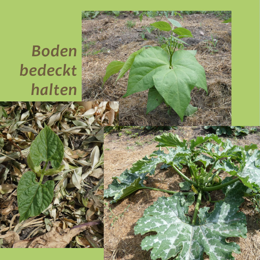 Die Pflanze selbst können wir darin unterstützen, mit dem gegossenen Wasser besser auszukommen, und zwar mit Mulch aus Pflanzenresten wie Rasenschnitt, Heckenschnitt, Beikraut oder Ernteresten. Wenn der Boden um die Pflanze herum mit einer Mulchschicht bedeckt ist, kann nicht viel Wasser verdunsten und es bleibt den Pflanzen verfügbar. Eine Wassergabe „in den Kragen des Mulchmantels“ gelangt dann direkt unter die Mulchauflage zu den Wurzeln. Ein mit Mulch bedeckter Boden heizt sich nicht so stark auf, was wiederum die Verdunstungsrate herabsenkt. Aus diesem Grund wird u.a. auch empfohlen, früh morgens zu gießen, wenn der Boden noch kühl ist.