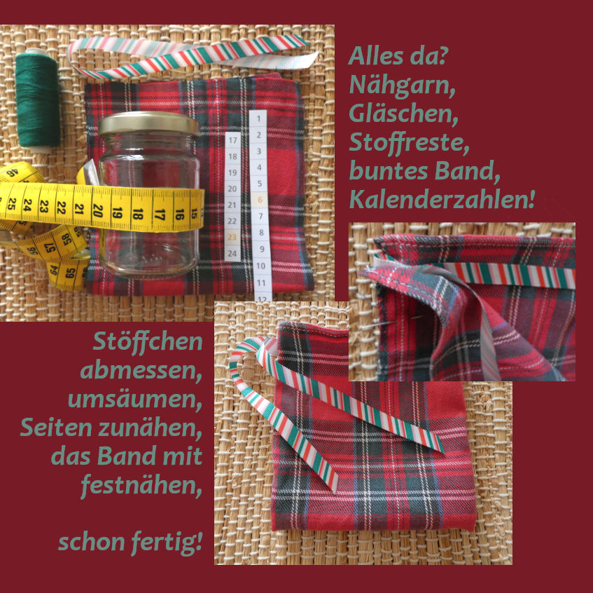für Kurzentschlossene. Für diesen Unverpackt-DIY-Adventkalender muss sich niemand die Nächte vor dem 1. Dezember um die Ohren schlagen, denn auf das Nähen von 24 Verpackungseinheiten haben wir einfach verzichtet. Sechs bis sieben Beutelchen reichen doch für die ersten Dezembertage und dann werden die zuerst leer gewordenen einfach erneut gefüllt und mit einer neuen Zahl – vom alten Kalenderblatt - versehen. So reicht auch eine kleine Anzahl an vorrätigen Gläschen und Döschen, die für Kekse oder Fruchtkugeln reserviert sein können. Ebenso auskömmlich ist dann eventuell auch der Vorrat an Zeit und ersten Ideen für abwechslungsreiche Füllungen. Viel Kreativität erwächst ja häufig erst aus dem Tun.