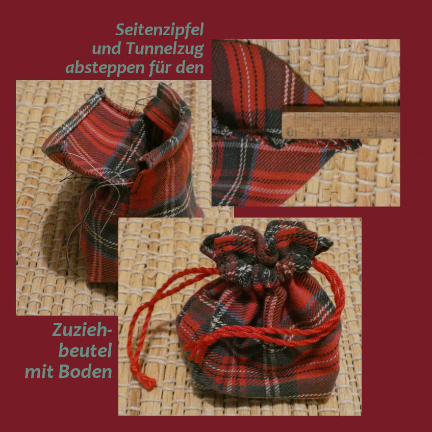 Wer Beutelchen mit Boden mag, möge beim Zuschnitt dann die Stofflänge und -breite etwas großzügiger wählen. Die geschlossenen Seitennähte werden im zukünftigen Bodenbereich des Säckchens zu rechtwinkligen Zipfeln gezogen und übereinandergelegt und an beiden Seiten auf gleicher Höhe abgesteppt. Jetzt nur noch die Zipfel abschneiden, Kanten mit Zickzack versäubern und fertig ist der Bodenbeutel.