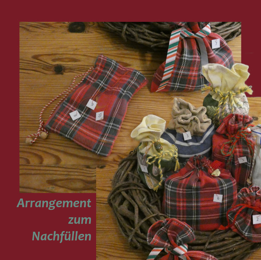 Mit dem Näherrücken des Weihnachtsfestes wird dieser Kalender nie erleben, gerupft oder geplündert aussehen zu müssen, da er immer wieder neu gefüllt wird mit Keksen, besonderen Nüssen, Samen, Zapfen aus dem Wald, mit kleinen Schätzen aus eigener Hand oder den Kreationen, die es auf den noch vor uns liegenden Adventsbasaren in Schulen, Kindergärten und Vereinen vielleicht zu entdecken gibt. Nun wünschen wir viel Freude beim Füllen und immer wieder neu Arrangieren.