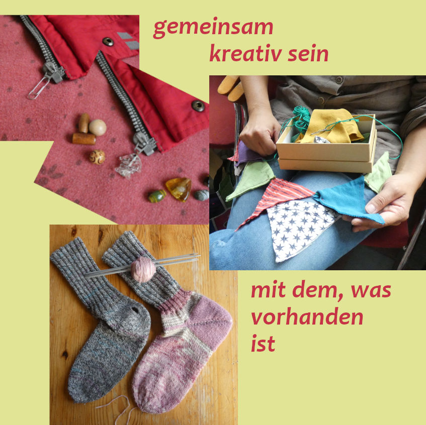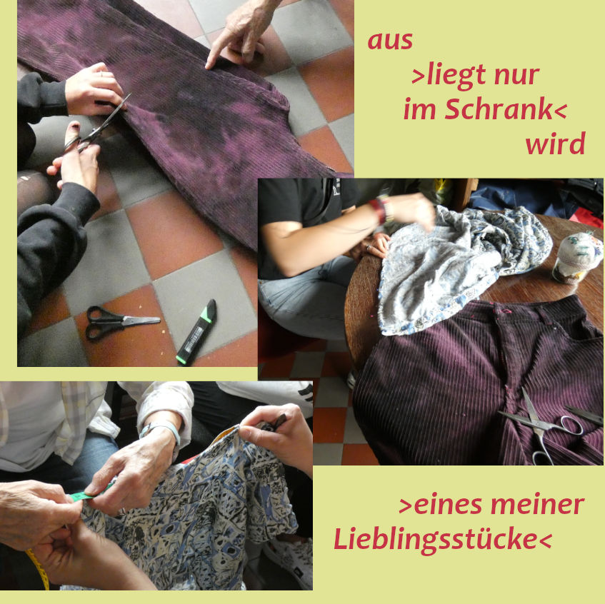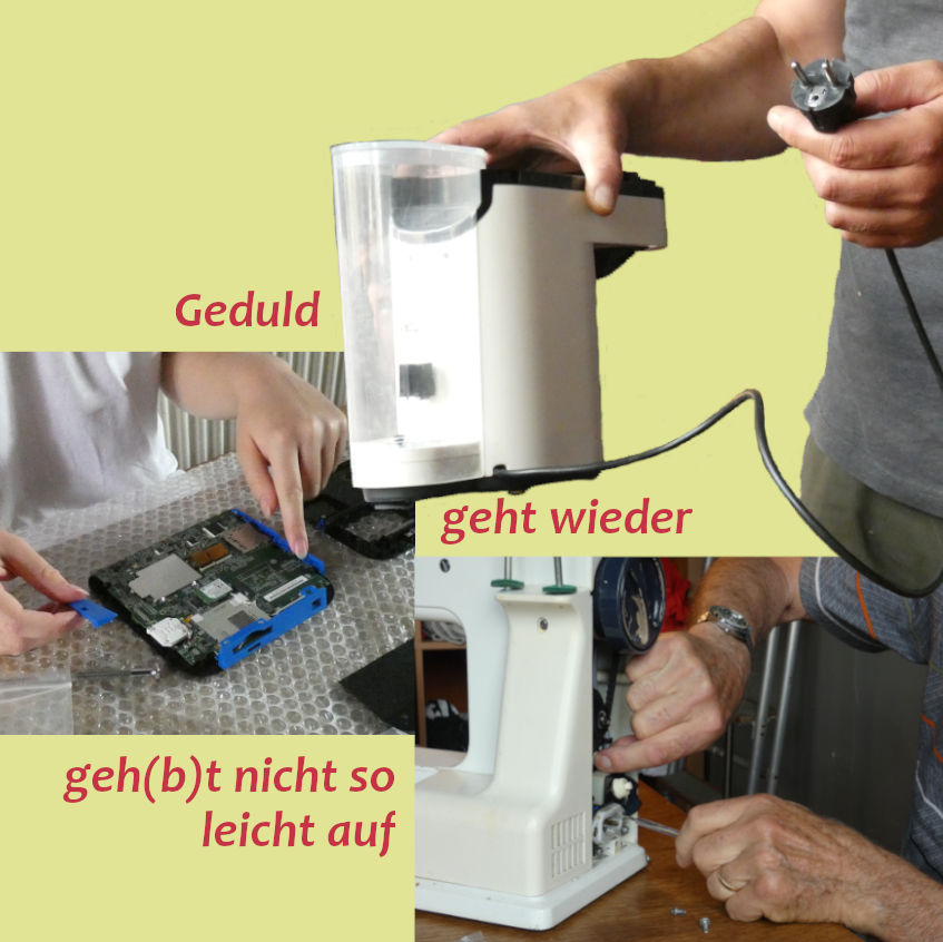 Manchmal ist es ja nur ein kleiner Defekt, der schnell oder mit viel Geduld wieder behoben ist und das Gerät "geht wieder". Oder jemand hat viele Ideen, wie z.B. die ungenutzte Hose wieder tragbar wird, findet aber keine Stelle, keinen Mut für den ersten Schnitt in den schönen Stoff. Auch für so einen Fall kann es Zuspruch und Unterstützung beim Repair-Treffen geben. Oder gibt es Hilfe beim Fahrradschlauch flicken? Angebote und Nachfragen ergeben sich jeweils von den Leuten vor Ort, die vielleicht ihre Nähmaschine angeschleppt haben oder lieber die Stricknadeln und das feine Schraubendreher-Set.