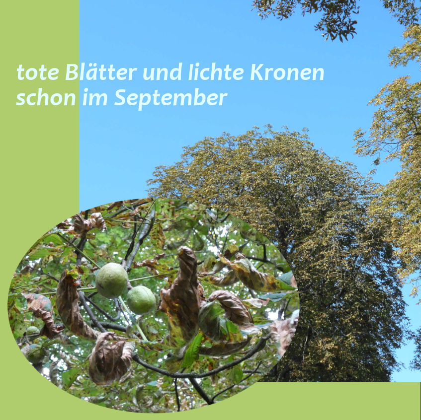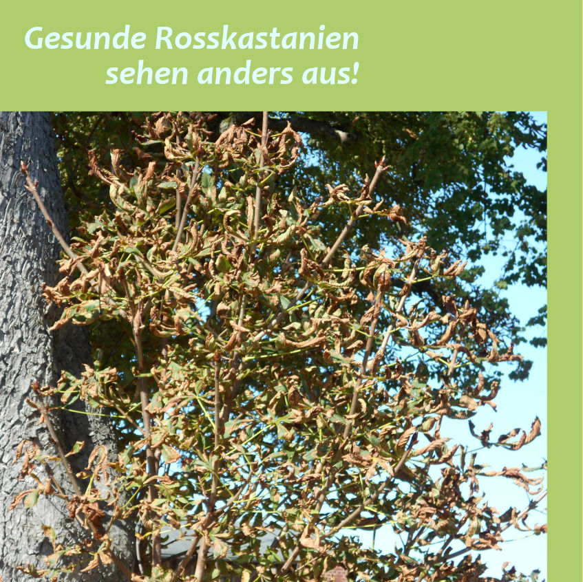 Landauf landab sehen viele Rosskastanien kränklich aus. Das Laub ist zusammengerollt, braun verfärbt und abgestorben und wird schon im September abgeworfen. Normalerweise wären die Blätter noch bis in den Oktober hinein satt grün, der Baum hätte noch Zeit für Photosynthese und Vorbereitung auf den Winter. So aber gibt es keine Vollendung des herbstlichen Zyklus mit bunter Laubfärbung und Rückverlagerung von Reservestoffen in den Stamm.