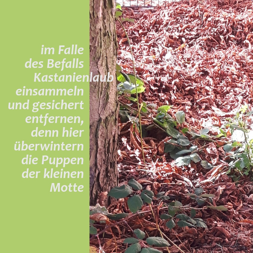 Daher auf zur Rettung. Was sonst zum Schutz des Bodens und der Tierwelt unterbleiben sollte, ist nun ausdrücklich erwünscht: Laub fegen, harken, zusammenkehren und abtransportieren. Im Laub überwintern nämlich die Puppen der Miniermotte. Aus ihnen schlüpft im nächsten Frühjahr die neue Generation an Faltern und will Eier an frisch ausgetriebene Kastanienblätter ablegen. Die Larven schlüpfen und zerfressen erneut die Blätter. Schluss damit! Das Winterquartier wird aufgeräumt und das Laub kommunal verbrannt oder bei hohen Temperaturen kompostiert. Das muss und soll also niemand privat erledigen. Über den Ablauf informiert der kommunale Entsorger.