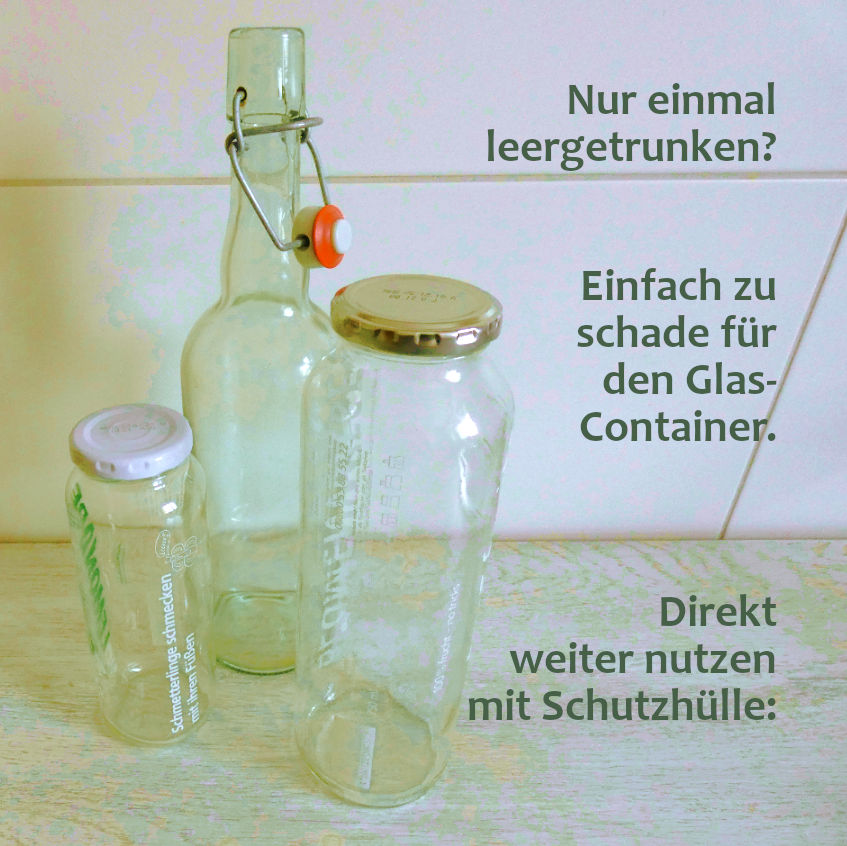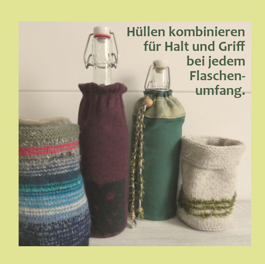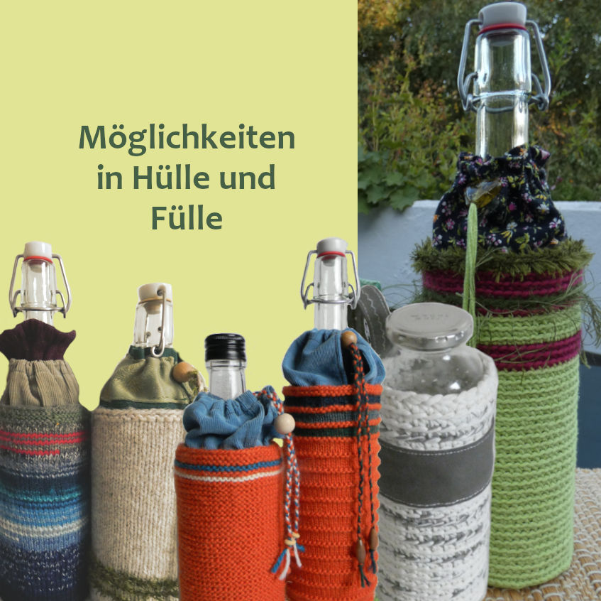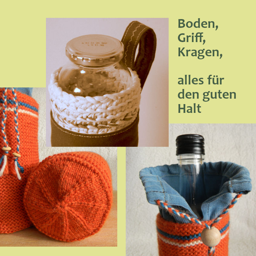 Für letzteres zeigen wir hier Abhilfe: Aus dicker Wolle, Bändchen- oder T-Shirtgarn lassen sich passende Hüllen stricken oder häkeln. Sie machen das Glas griffig, schützen es vor Stößen und der Gefahr, zu zerbrechen. Die Hüllen isolieren zeitweilig den Inhalt gegenüber der Außentemperatur, halten ihn unterwegs länger warm oder kalt. Das gilt auch für Behälter aus Metall. Manche Flaschen können vielleicht auch deshalb eine Hülle vertragen, um Werbeaufdrucke zu verbergen.