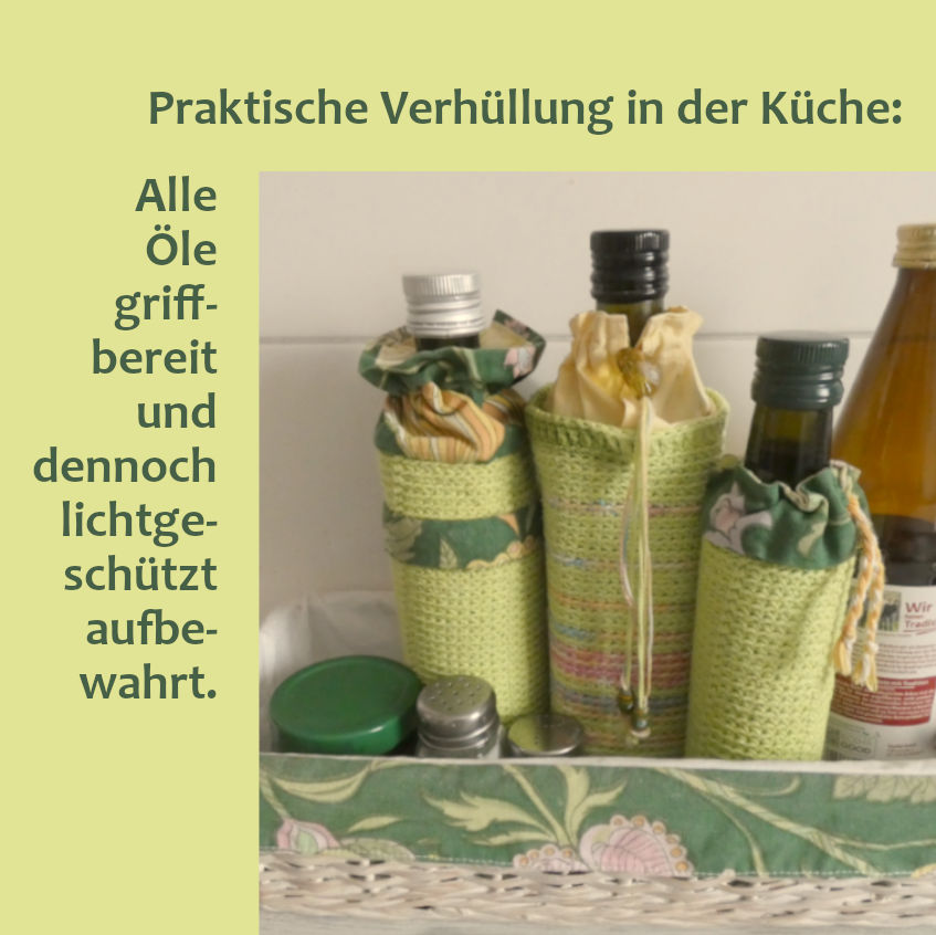 - In der Küche stehen die Speiseöle mit den passenden Hüllen immer griffbereit. Die lichtabweisenden Ummantelungen um die Flaschen verwahren sie quasi im Dunkeln und die wertvollen Inhaltstoffe der Öle bleiben geschützt.