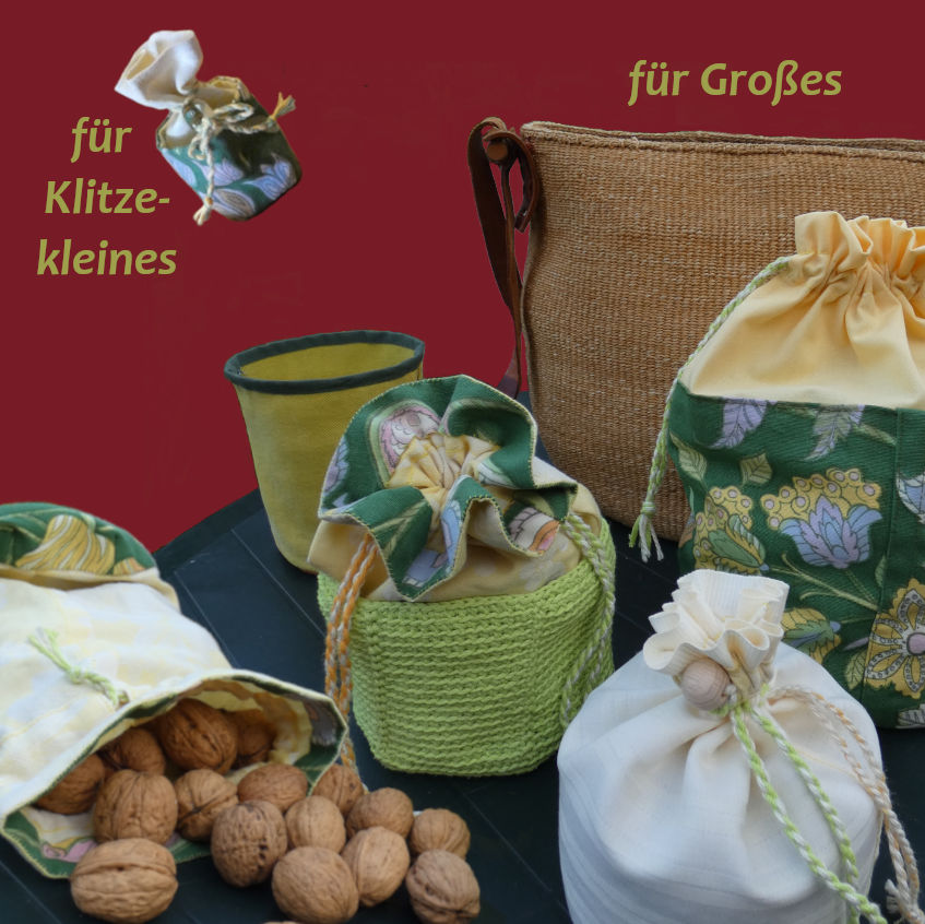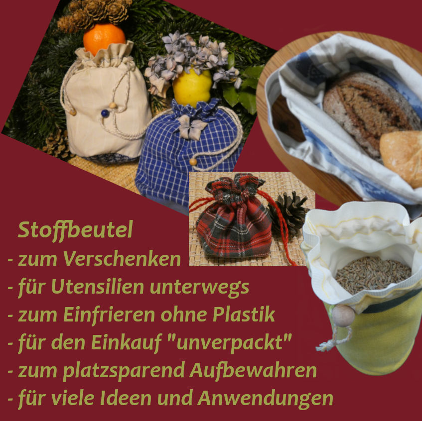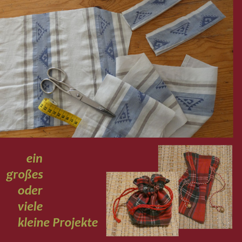 Die guten Stoffpartien eines zerschlissenen Kleidungsstücks oder von Bettwäsche sind zu schade für den Müll, können so noch lange nützlich sein und ihr Material im Umlauf halten. Selbst kleine Stoffreste erhalten eine Aufwertung, wenn sie z.B. als eines von 7 bis 24 Säckchen für den Do-It-Yourself-Adventskalender den Stoffrestestapel verlassen können.