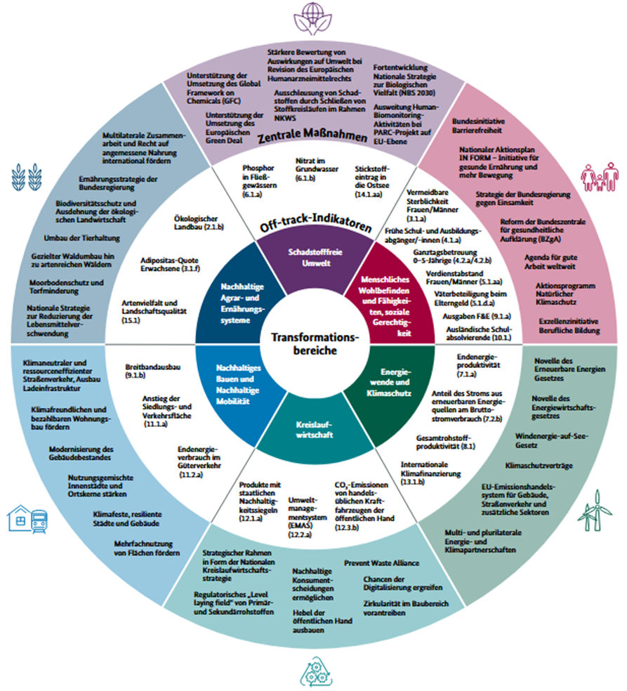 Mit der Deutschen Nachhaltigkeitsstrategie [3] hat die Bundesregierung konkret dargelegt, wie diese 17 SDGs umgesetzt werden. Dabei wurden sowohl die Transformationsbereiche